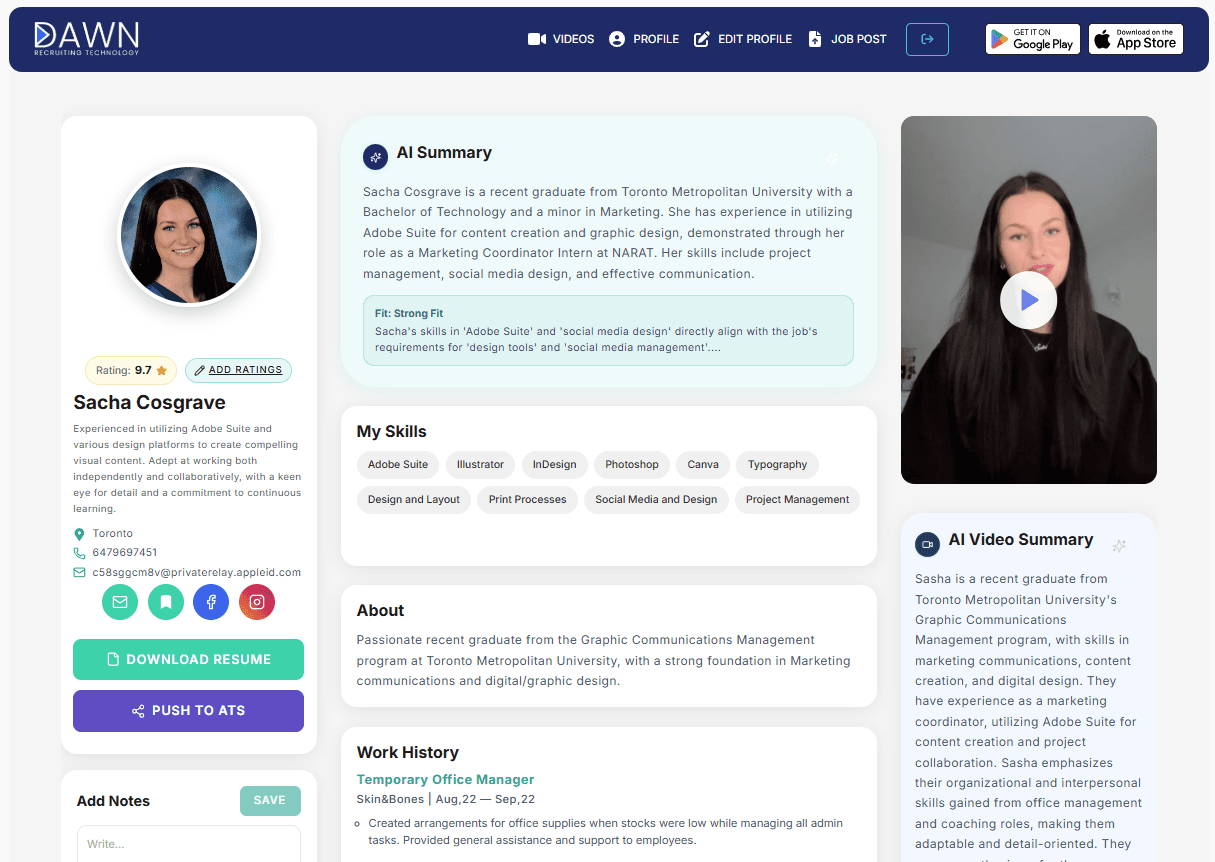 Dawn simplifies your entire screening workflow while giving you deeper insight into every applicant. In the new age of AI, Dawn shows you real candidates on video the moment they apply — no guessing, no endless filtering, just instant clarity on who’s worth your time. Make hiring faster, sharper, and dramatically more efficient.